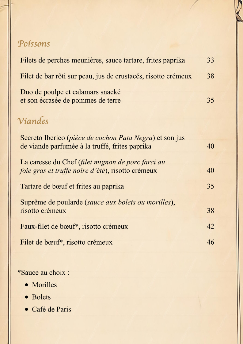The menu at Café De La Poste Onex offers an impressive selection of dishes that showcase a mix of French and Swiss culinary traditions. For those who enjoy rich and flavorful meats, the Selle de Chevreuil (a tender venison saddle) and Civet de Cerf Sauce Chasseur (a deer stew with a savory hunter’s sauce) are standout options, offering a truly authentic taste of the region. The Noisettes de Chevreuil Sauce Grand Veneur is another excellent choice, with its delicate venison accompanied by a classic, luxurious sauce.
