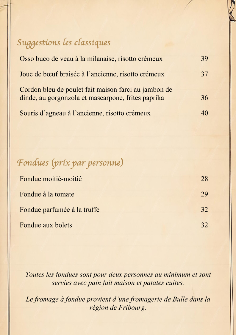 The restaurant also offers a variety of sides, including Spätzli, a Swiss-style dumpling, and Frites Paprika, perfectly crispy paprika fries, both ideal accompaniments to any dish on the menu.