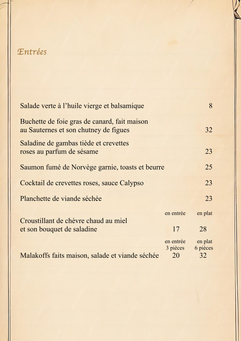 To finish off your meal, the Tarte Tatin (caramelized apple tart) and Gâteau Fin Aux Pommes (fine apple cake) offer a sweet, satisfying conclusion. If you prefer something lighter, the Panna Cotta provides a creamy, refreshing dessert that balances out the richness of the meal.