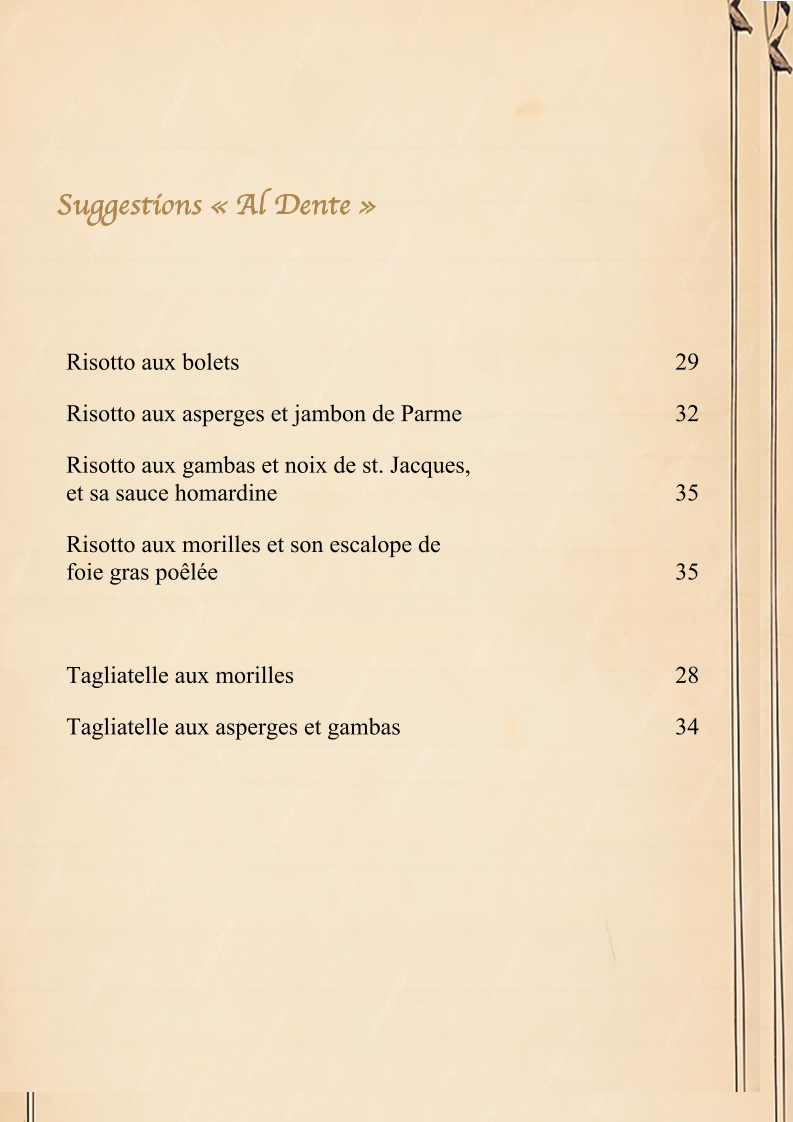 Vegetarian options such as the Risotto Aux Morilles (creamy morel mushroom risotto) are equally impressive, offering earthy and savory flavors. If you’re looking for something more indulgent, the Foie Gras Et Magret de Canard (foie gras with duck breast) is a luxurious dish that promises an unforgettable experience. Another great option is the Gnocchis Aux Calamarettis, a flavorful combination of gnocchi and tender calamari.